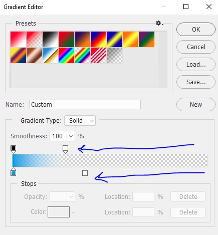 Click on the gradient and adjust it so it goes from blue to white and the opacity reduces as shown.