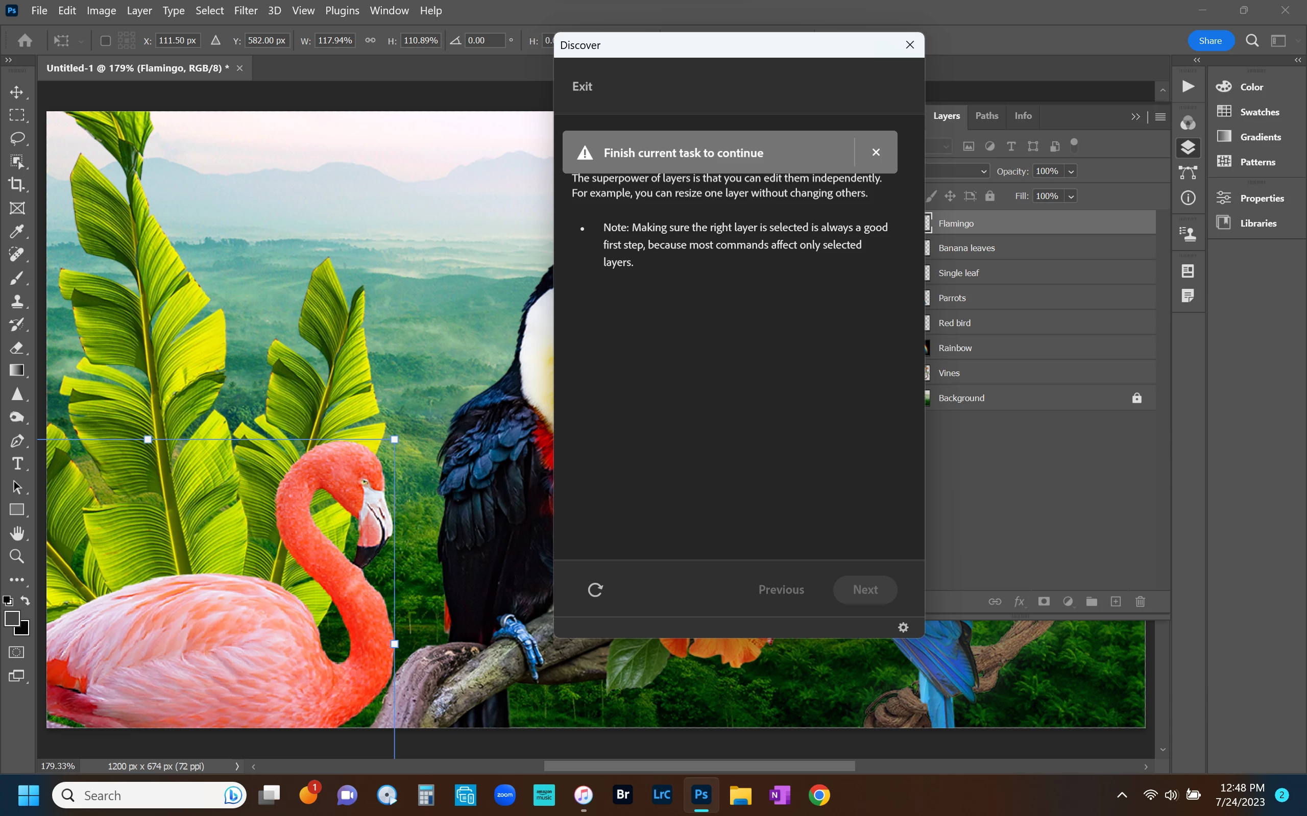 When using the tutorial entitled "Get to Know Layers", the tutorial freezes after I complete the task to "Transform" the flamingo in the image. It keeps saying "Complete the current task before proceeding", even though I did complete the task, and the "Next" button is grayed out, and I get stuck. I have to "End Task" Photoshop in the Windows Task Mnager to get out of that.
