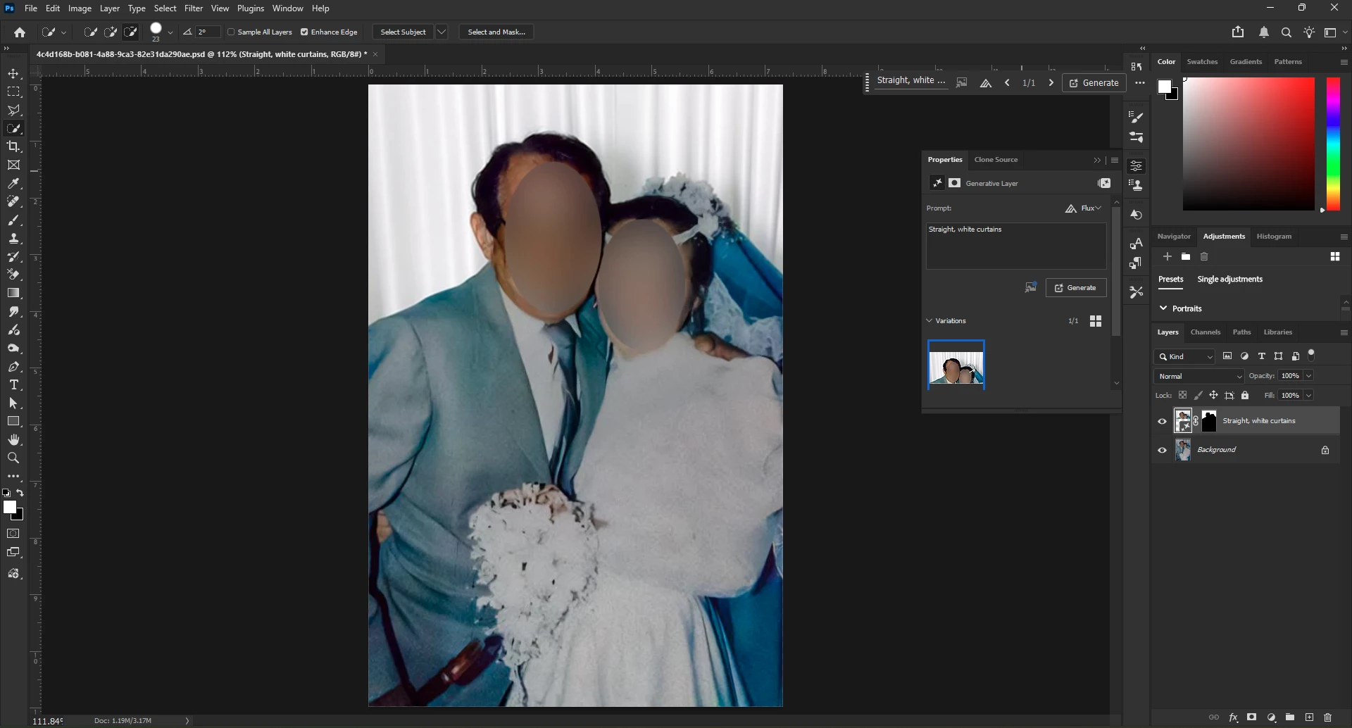 - Why does GF hew to the color of the central objects. For instance, today, I have an old photo of two people dressed largely in blue. I requested a fill behind of “white curtains,” but the curtains are generated as blue. Why does GF not allow me to choose what colors I want?