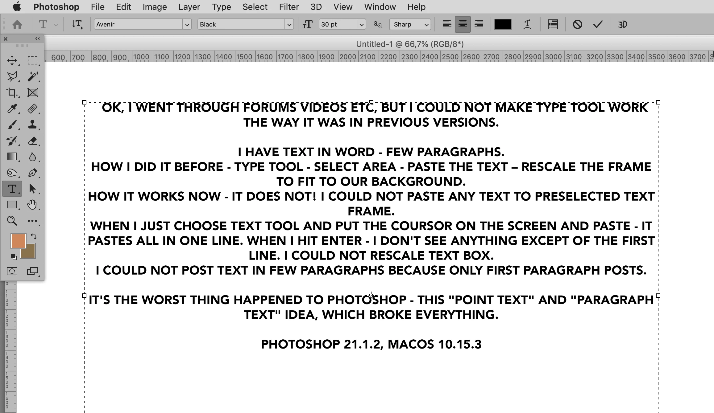 It's the worst thing happened to Photoshop - this "Point text" and "Paragraph text" idea, which broke everything.