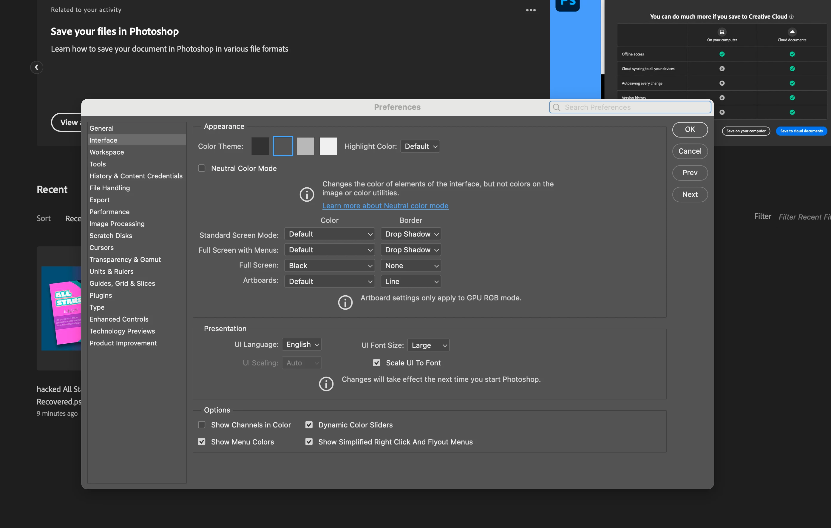 I am trying to increase the size of the icons in PS, and have gone into Preferences and then Interface, and tried to change the drop-down to both medium and large icons, both with and without the "Scale UI to font" selected, and nothing is changing. I am then quitting the program, and restarting and still nada. AI changed just fine, and has an easier menu IMO as well.