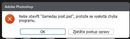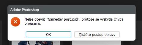 JJakub_98ParticipantForum|Forum|2 years agoDecember 3, 2023QuestionUnable to openForum|Forum|2 years agoDecember 3, 20230 replies139 viewsUnable to open "Gameday post.psd" , because of a program error.It happened during the last update. Please help me quickly. Thank you Windows