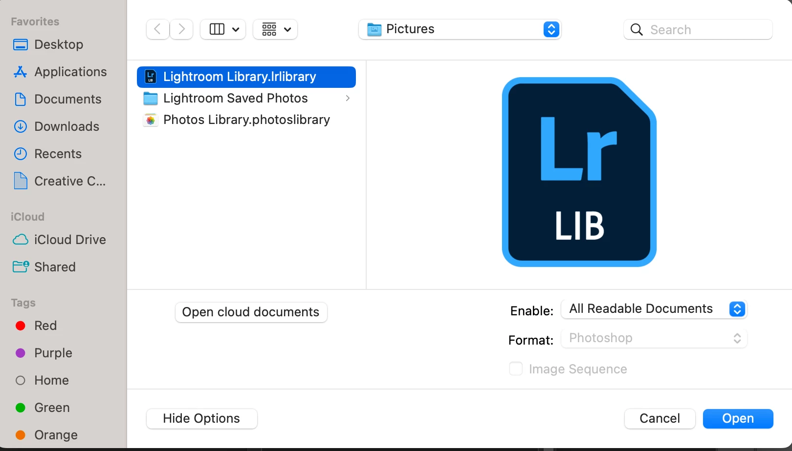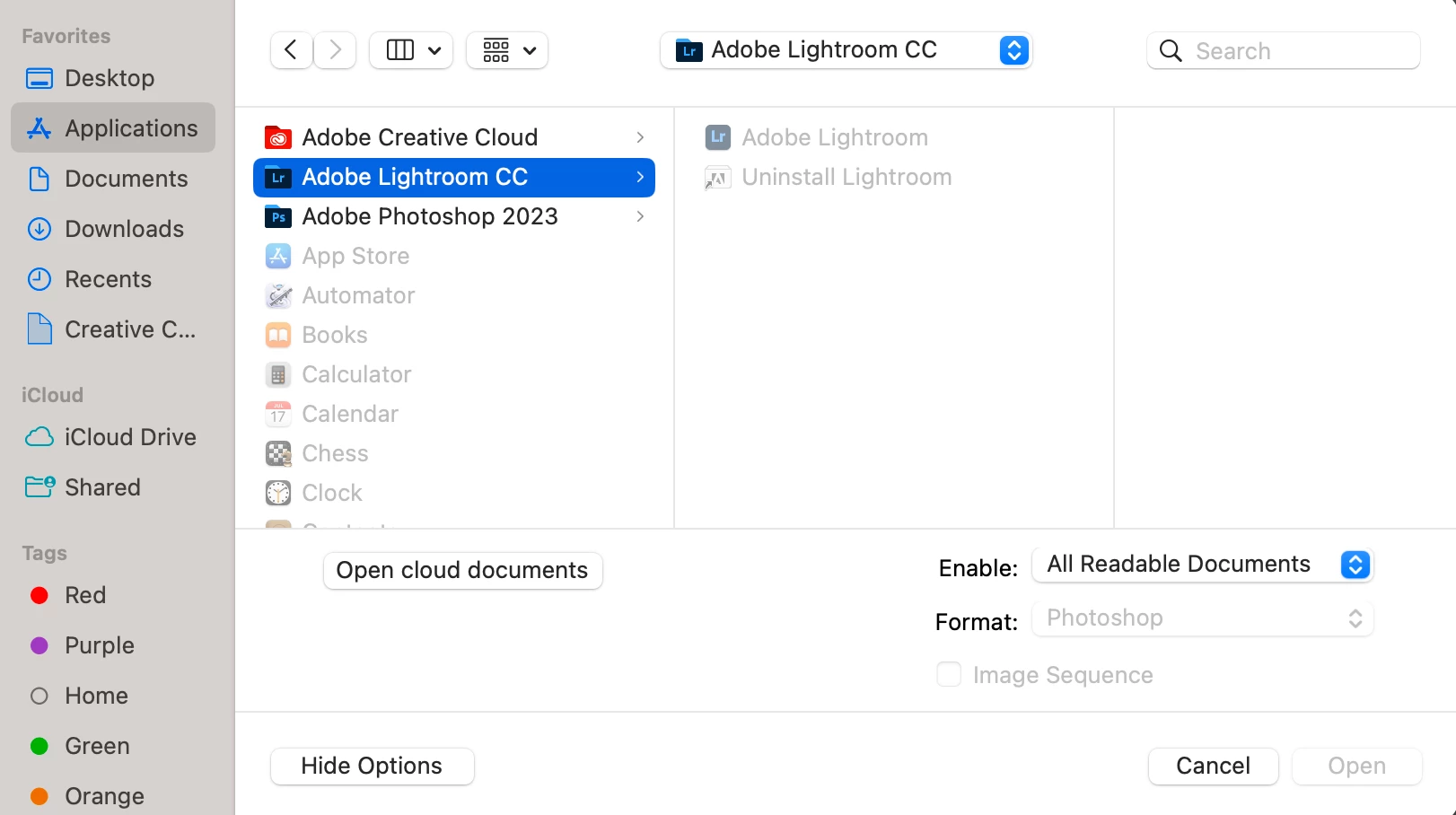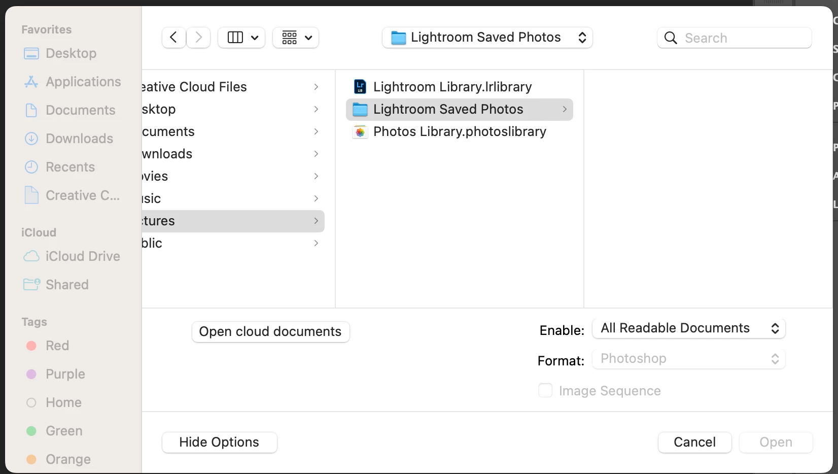 Hi All - I just downloaded PS version 24.7 (and Lightroom) on my MacBook Pro (OS Ventura 13.5.1) and after initially working fine, PS no longer can open files (File > open file) (or embed them) but instead shows a grayed out menu of applications (including Lightroom) (first screenshot below). I can get to "Lightroom library" in a pictures folder but the file type is not recognized by PS (second and third screenshots). The "Lightroom saved photos" folder shows empty even though I have photos saved in Lightroom (fourth screenshot). The file type in the (Apple) Photos library is also not recognized by PS. Thanks!