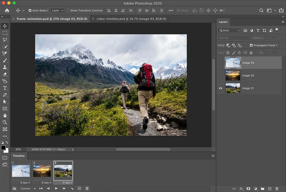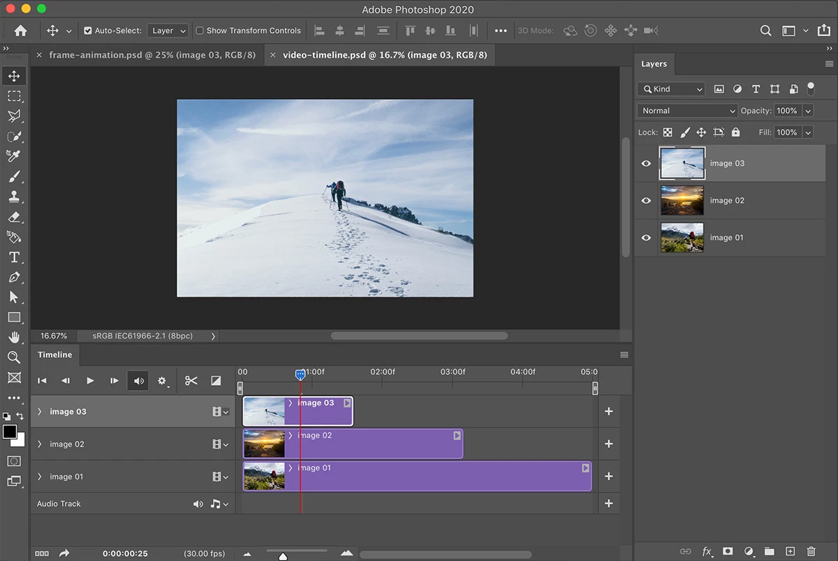 If you go down the frame animation route you will get a timeline that looks like the image below. This method controls which image is visible by turning on and off the visibility of layers on a per frame basis.