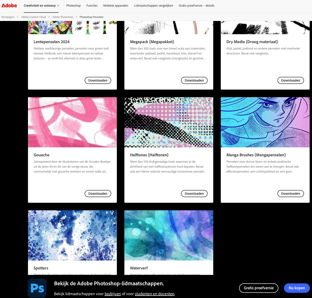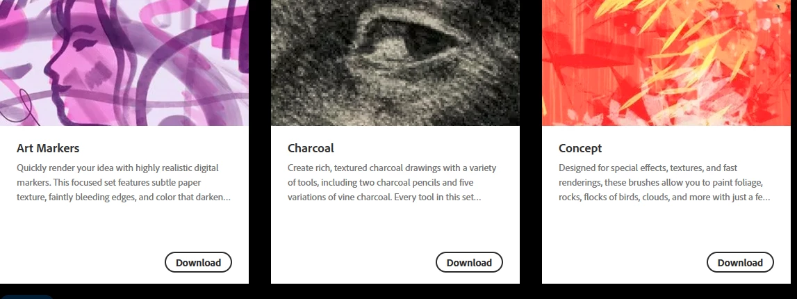 When I click "Get More Brushes" and scroll down on Adobe.com, I can only download eight Kyle Webster brush packs. Unfortunately, "Charcoal" and "Concept," among others, are no longer available. Does anyone know how I can download and use them again? Thanks in advance.