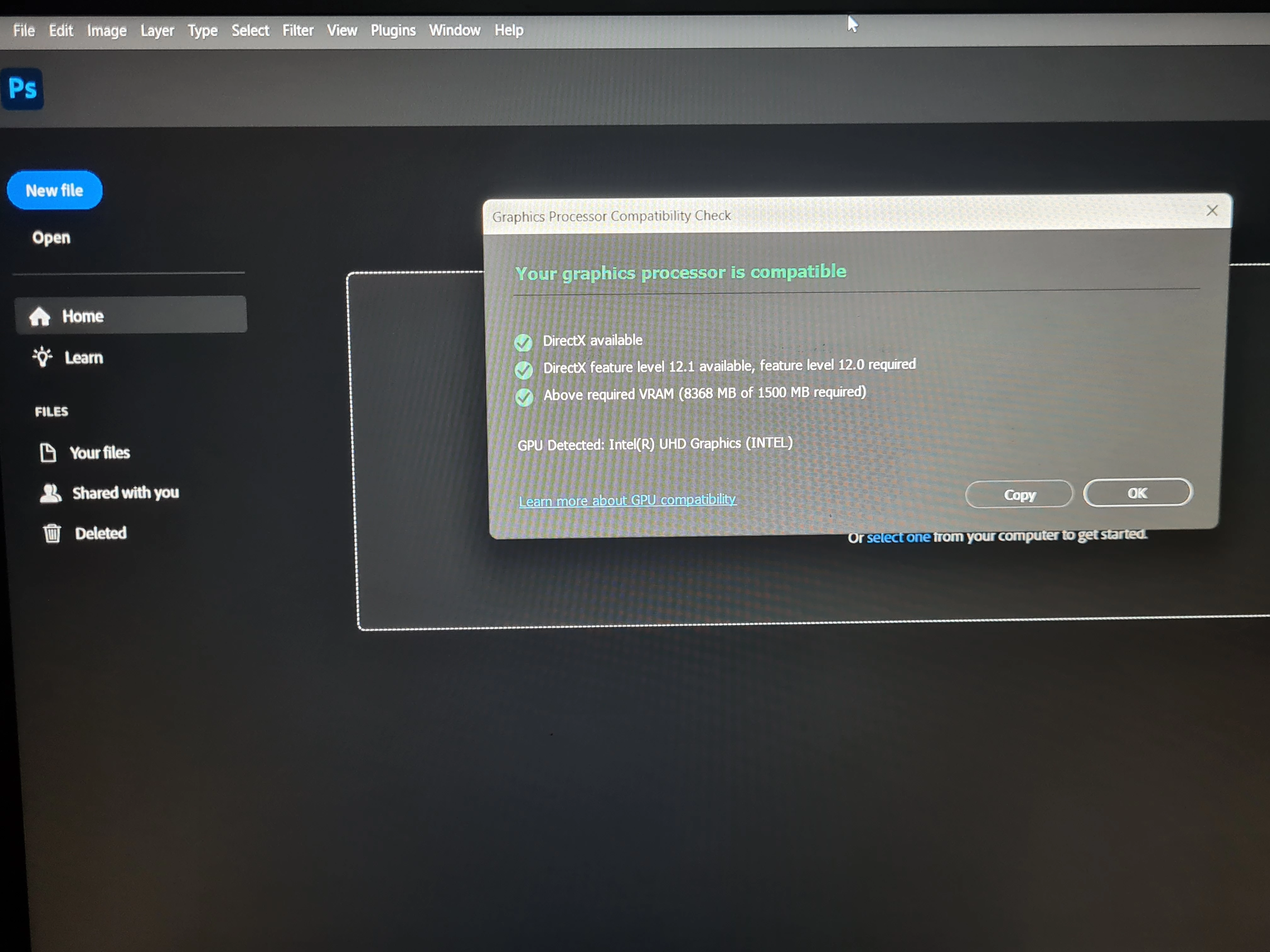 I don't know what I'm going to say next is true or not but I believe the problem is intel driver, I mean the driver says my gpu is intel uhd but doesn't specify the model like 620, 630 etc. And maybe this is what's causing photoshop unknown gpu error. Any ideas about that?
