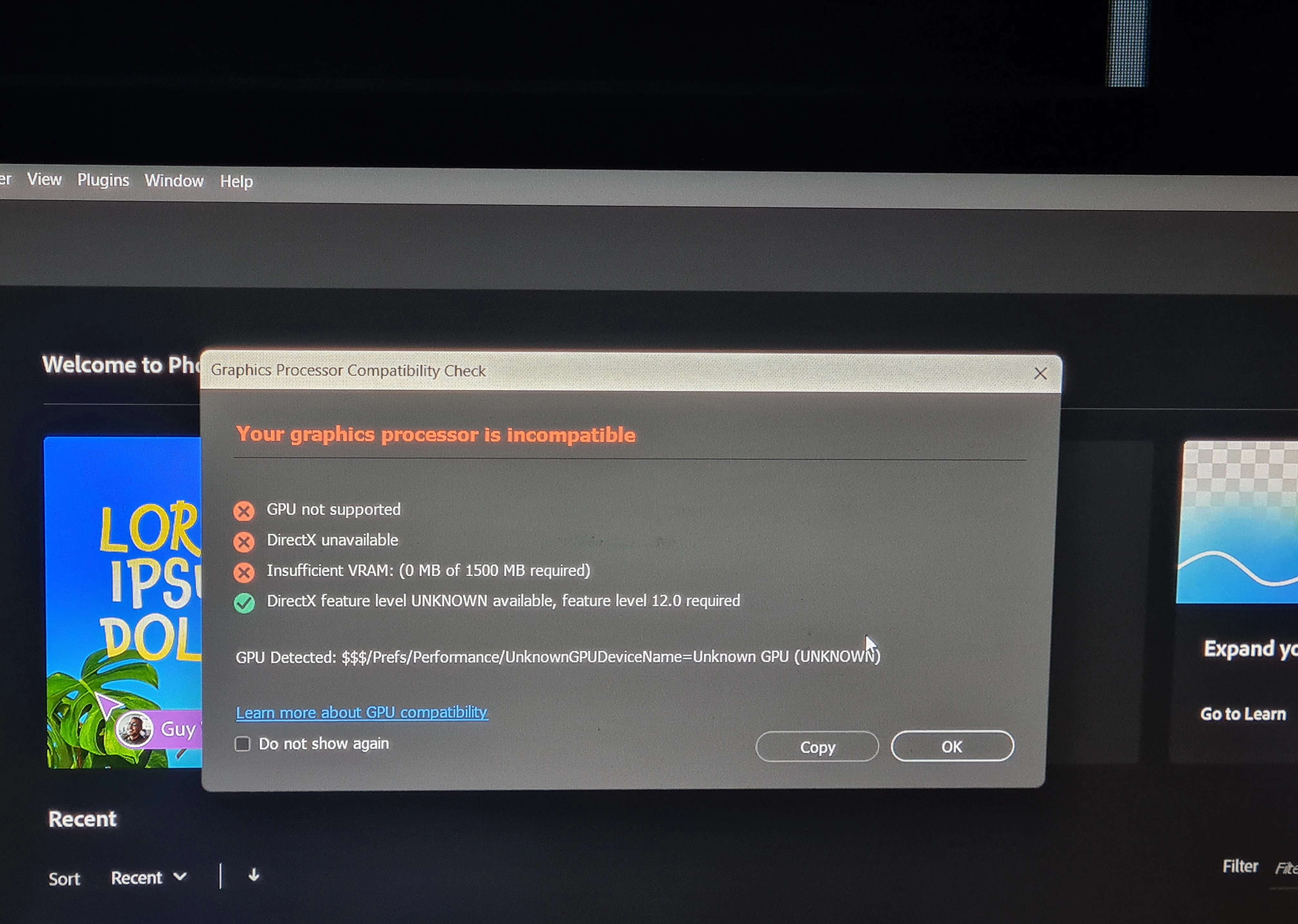 I'm having a problem where I install nad launch photoshop for the first time it checks everything ok but next time I open it unchecks everything and says unknown gpu. My gpu has direct x 12 features, latest drivers installed, have uninstalled and reinstalled photoshop a couple of times, Pleassseee HELP ME 🙏🙏🙏