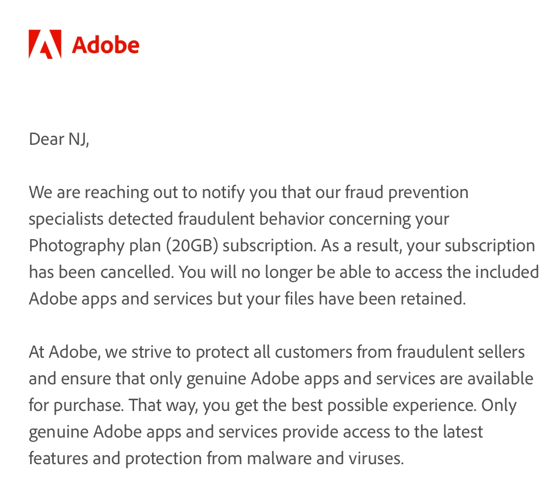 I must express my extreme frustration and disbelief upon receiving your email stating that my Photography plan (20GB) subscription has been canceled due to alleged fraudulent behavior. I need this issue resolved promptly, as I rely on Adobe's services for my work.