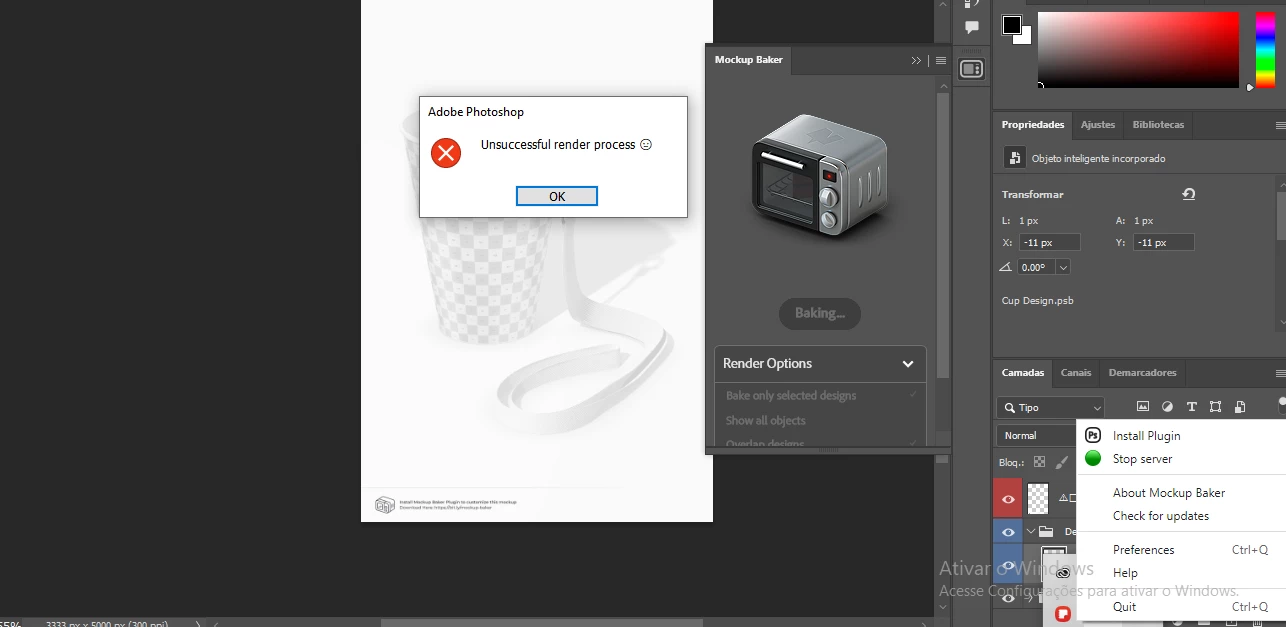 Olá, pessoal! Estou enfrentando um problema sério ao tentar usar a ferramenta Mockup Baker da Freepik, que integra com o Adobe Photoshop.