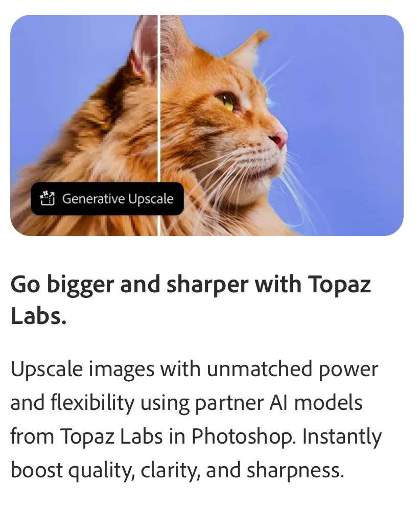 As far as whether you can stop paying for Topaz, you should look over what’s included in Photoshop and see if there’s enough of what you like about Topaz. And also pay attention to the number of Adobe generative credits that a Topaz generation consumes, compared to Adobe Firefly or other partner models.