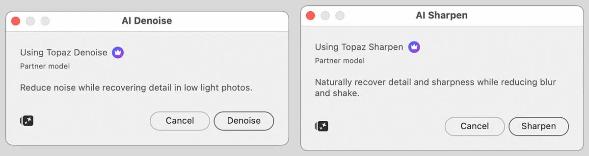 Some Topaz models are now available in some Photoshop generative AI features, such as in the new commands Image > Generative Upscale, Filter > AI Denoise, and Filter > AI Sharpen, shown below. I haven’t used the standalone version of Topaz, but my understanding is that what Photoshop includes is a subset, not everything. Which might change over time.