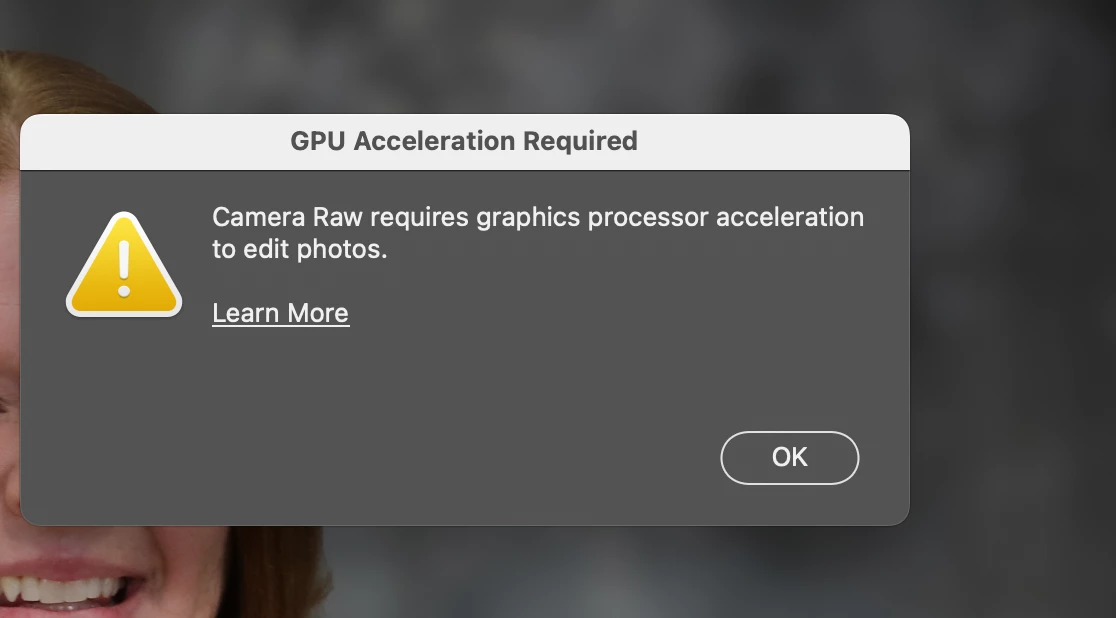 I cannot use camera raw filter anymore. This started 2 weeks ago. I get this message. Learn more does not do anything. I did some more checking and the Use Graphics Processor in the performance settings is greyed out and you cannot select anything. I downgraded to other versions of PS, but not luck. I can use the camera raw filter in lightroom. Is this a mac OS/graphics processor issue or someting else.
