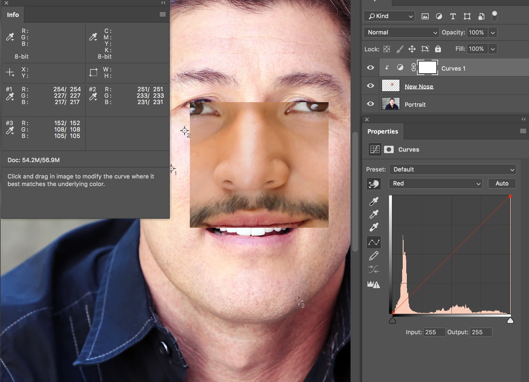 - I create a Curves adjustment layer and clip it to the New Nose Layer