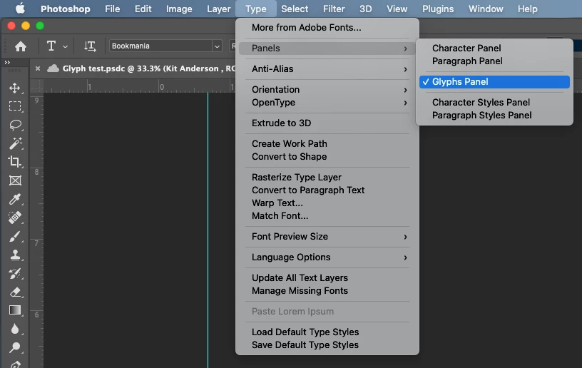 You can open the Glyphs Panel from the main Photoshop menu in one of two ways: