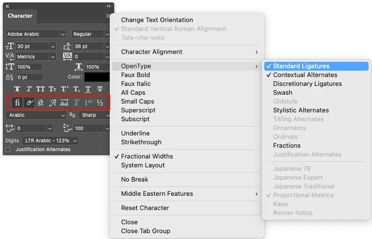 To configure and use the options choose an OpenType font, create and select some text, and then click on the desired OpenType icon in the Characters panel. These icons are also visible on the Type Layer Properties panel. You can also find the list of OpenType options by clicking on the 4 lines in the top right of the Character panel and selecting OpenType from the flyout menu. You will not be able to click on OpenType and choose options if you are using a font that is not OpenType.