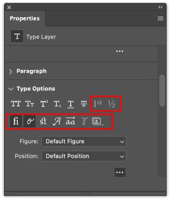 OpenType icons are also in the Type Options section of the Type Layer Properties panel.