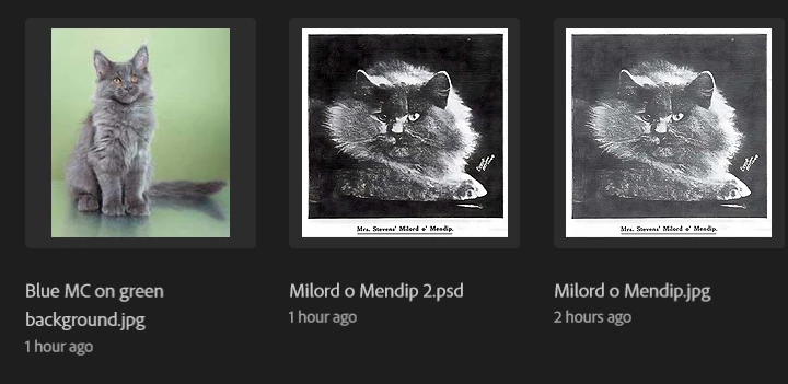 I've been able to go through the following progression of Milord o Mendip but I was expecting more cleanup of the scratches and horizontal lines in the photos. Colorize just gave me a brownish tone to the lighter areas of the image. I tried Color Transfer to move the colors of the Blue MC (yes in cat world we call that color grey blue) to the Milord o Mendip image but it didn't do anything except give the entire image a very patchy yellowish green cast. I know I can put a different background in manually but I really need the color of the MC coat to transfer to the Milord image. Am I doing something wrong with the neural filter? Or is there a different approach I should be taking? For anyone who cares, DeepAI doesn't do any better with colorizing the image.