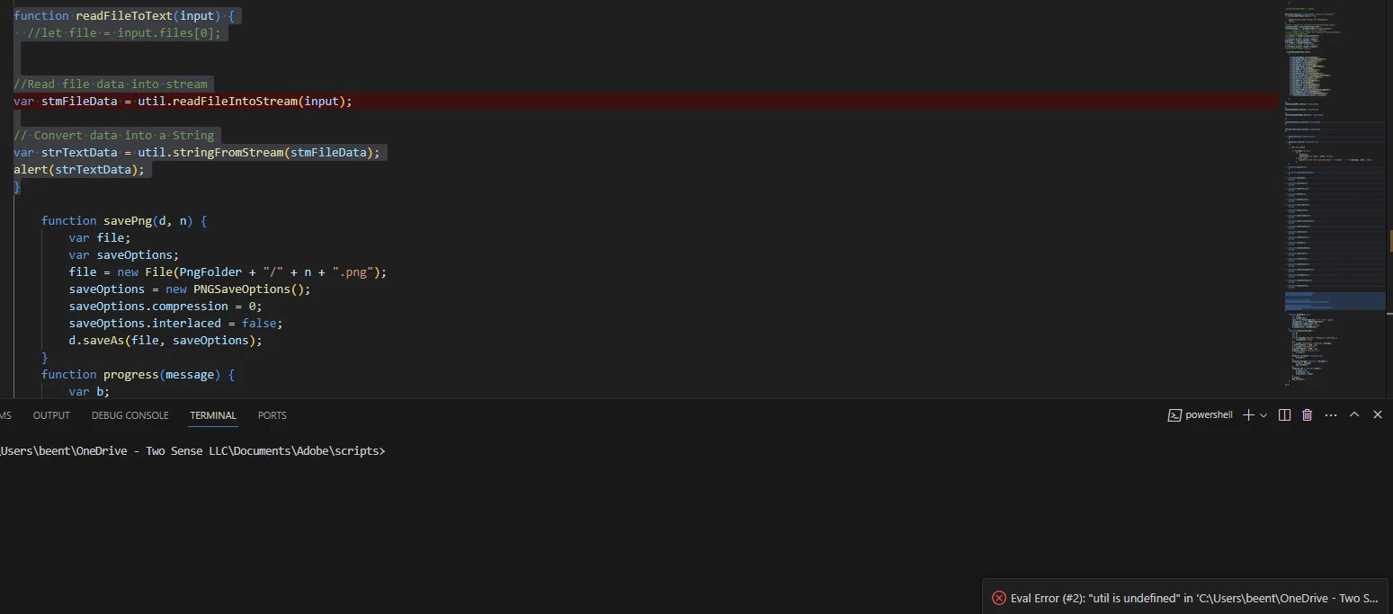 I am tring to read a text file with adobe scripts I am doing it in photo shop using extend scripts in visual studio code. When i try to launch i am getting the following error. I am guessing it is missing the referance to the utilites but i dont know how to add them.