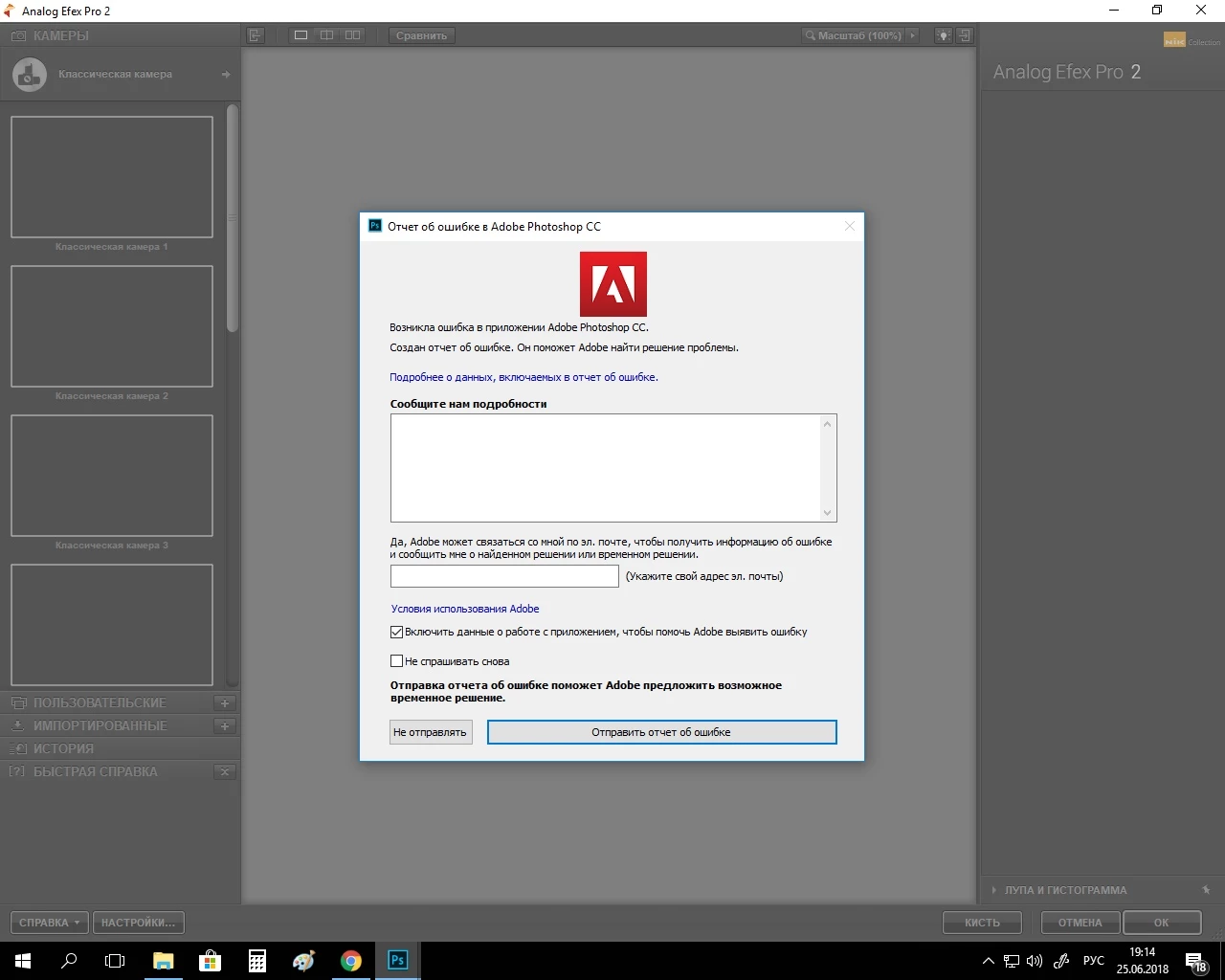 При попытке применить плагин Nik Software Color Efex Pro вылетает фотошоп полностью, пробовала разные способы устранения проблемы приведенные на форуме как возможные (отключала графический, меняла число кеша , драйвера и ос новые)