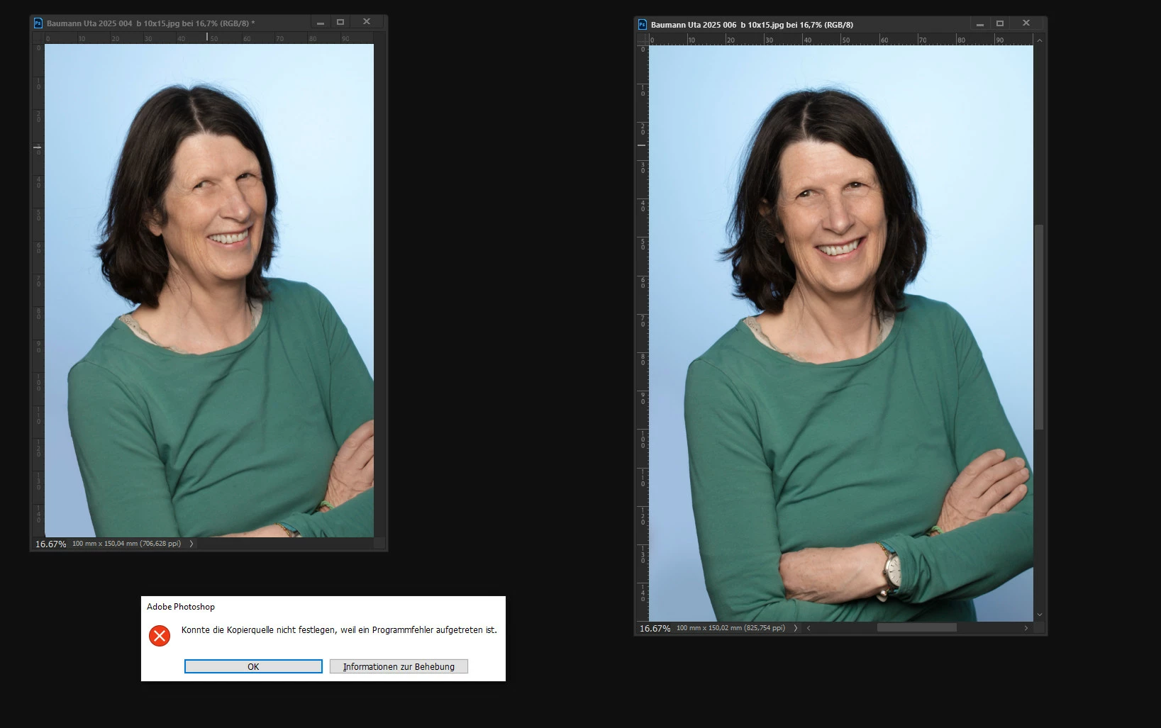 Seit Version 26.6.0 passiert es extrem häufig, dass Photoshop z. B. bei der Auswahl eines anderen Werkzeuges oder z. B. auch bei der Nutzung des Reparaturpinsels (sobald man per Alt-Taste und Klick ins Bild eine neue Reparaturquelle aussuchen möchte) den Fokus in ein anderes offenes Bild switcht und eine Fehlermeldung auftaucht. Bei Version 26.6.1 ist das nicht besser geworden. Bei den früheren Versionen tritt dieses Problem nicht auf.
