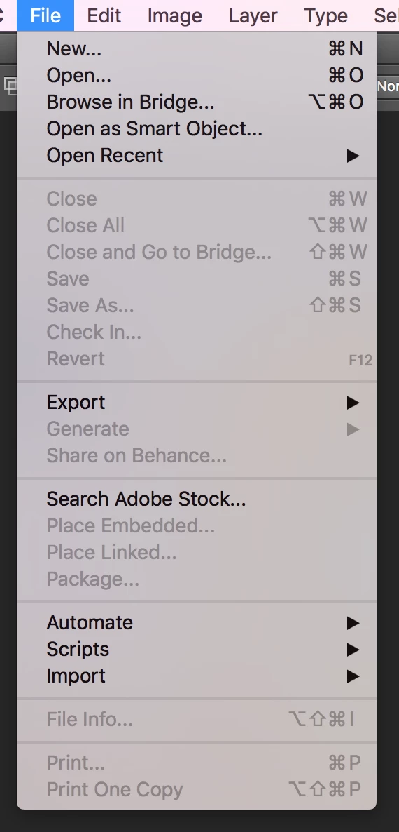 I do not think that is possible. All things that you can do in Photoshop's UI can not be automated with Photoshop Actions and Scripts. You can open/use the available items in the File menu the ones you show that have not been grayed out. I believe Photoshop UI process would need to be in control to open its menu File. I do not believe a script can replace or take over control of Photoshop's UI.