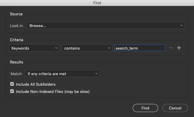 The following conditional ExifTool Mac OS command will recurse into all sub-folders under the top level input folder and find/list all files that contain a keyword of "search_term":