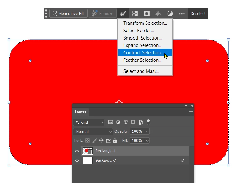 This is one of those times when the Contextual Task Bar becomes your friend. If we are going to feather the mask, then the mask needs to be smaller than the object. So we Ctrl/Cmd click the layer to load it as a selection, then click on the CTB dropdown and chose Contract Selection. Ideally, we need to have an idea of how much we intend to blur that outline so we contract by the right amount.