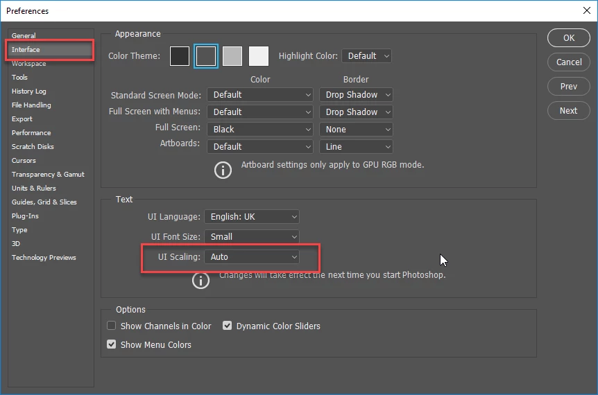 Setting PS to 100% gives me microscopic interface, and while I like tinty interface which shows a lot of information on the display, this is way too small and not the best condition in a working envinroment.