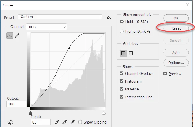 It used to be that there was a reset button in the Curves adjustment. If you held down alt/opt, the Auto button would change to reset, which you could click to zero out any changes you may have made to Curves. That option is now gone. Is there now another simple way to reset the curves adjustment?