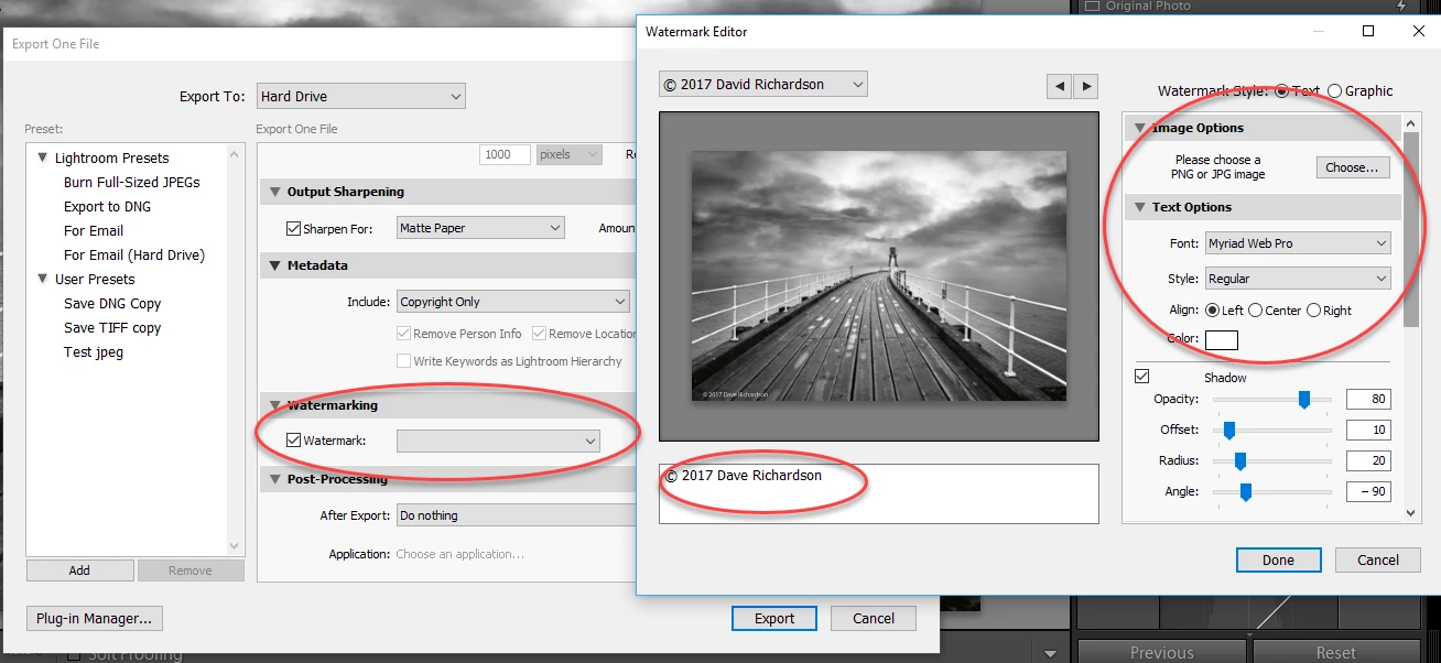 What is the easiest way to add a signature and copyright symbol to photos?