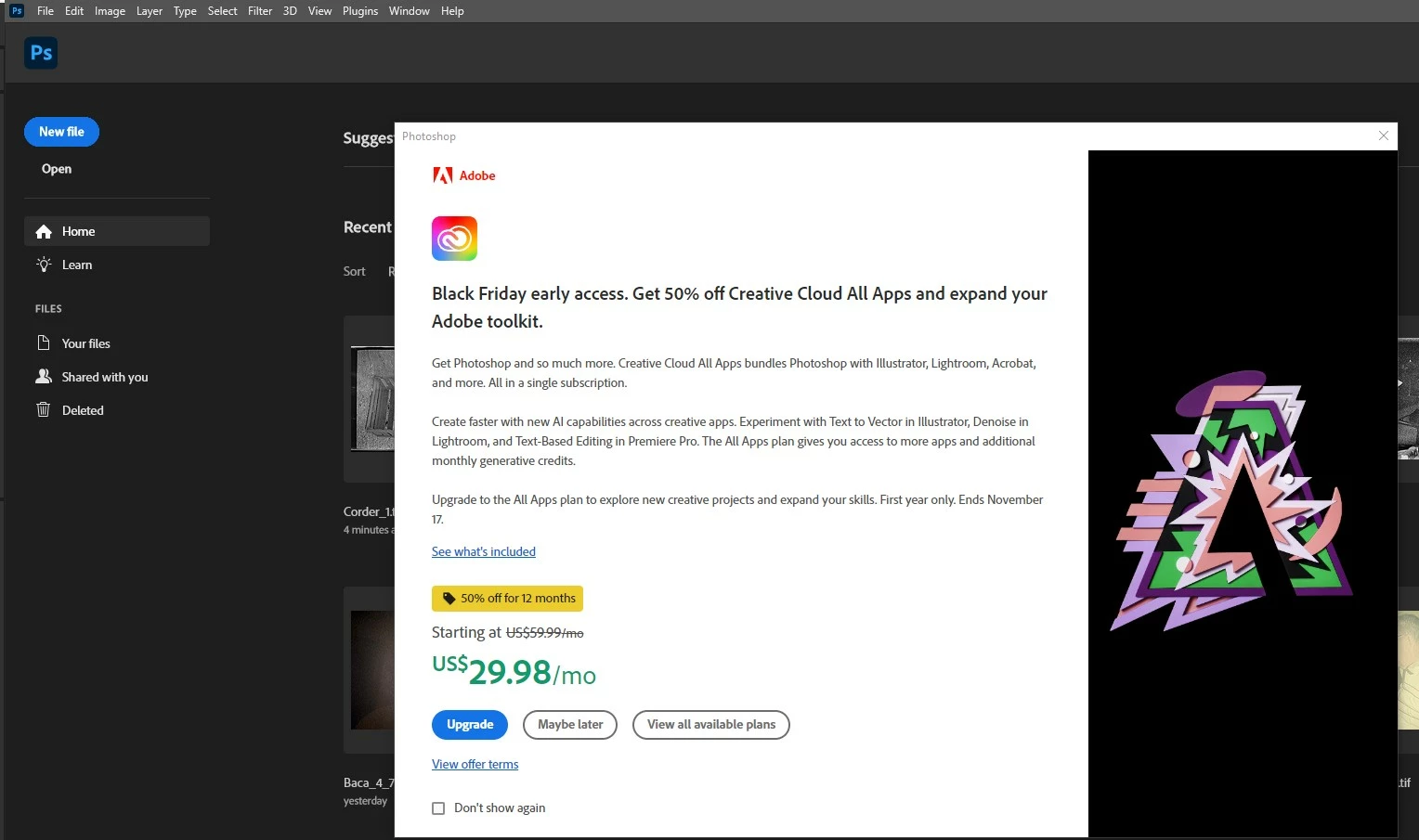 Please stop with the ads when I open Photoshop. This is a paid subscription and with that comes an expectation of not having to look at ads. I don't like Black Friday and I don't use Creative Cloud. Annoying