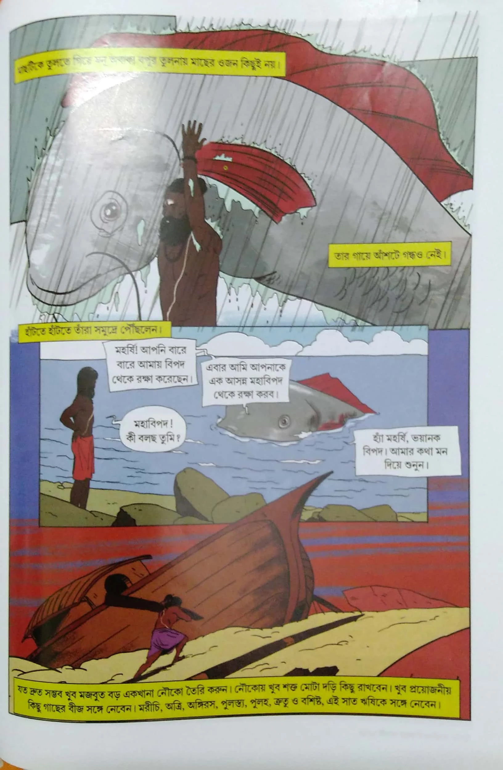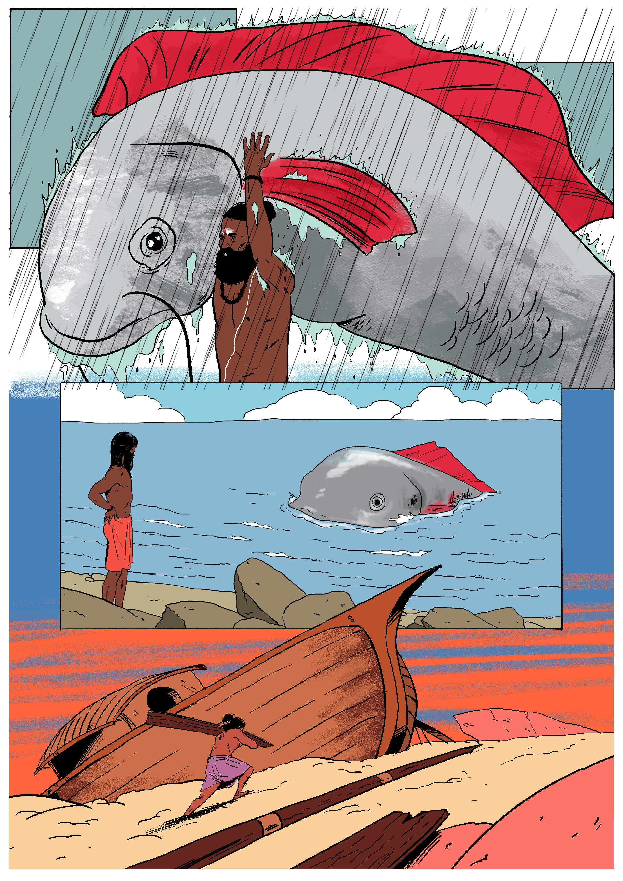 And here is the printed version which is darker. I clicked the photo below on my phone, so it isn't perfect, but the darker shades are visible on the character's skin, the rocks and the wooden elements in the last panel.