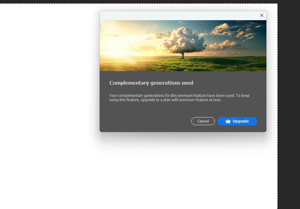 "Complementary generations used. Your complementary generations for this premium feature have been used. To keep using this feature, upgrade to a plan with premium feature access."