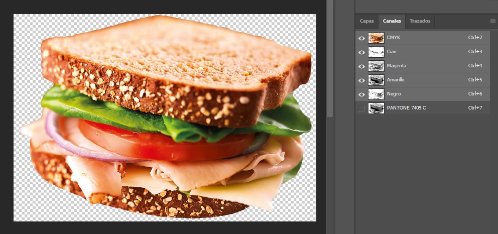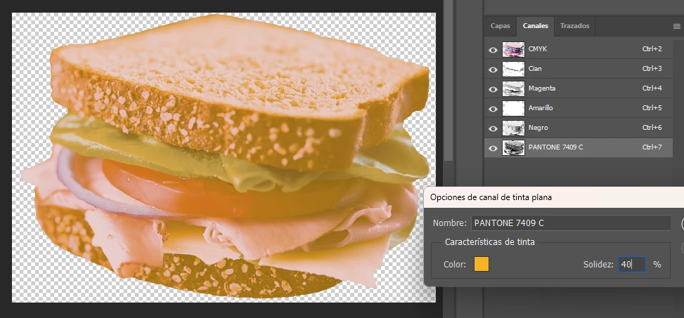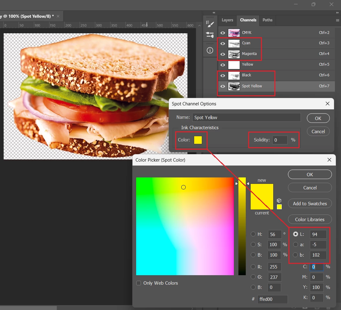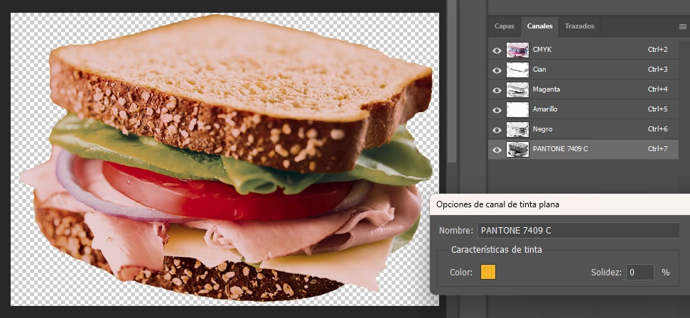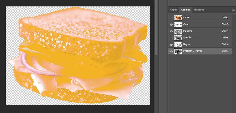 → Here’s the same image, where the Yellow channel has been made into a spot color (that will print with Pantone). It nearly blocks everything, like it lays over the other channels.
