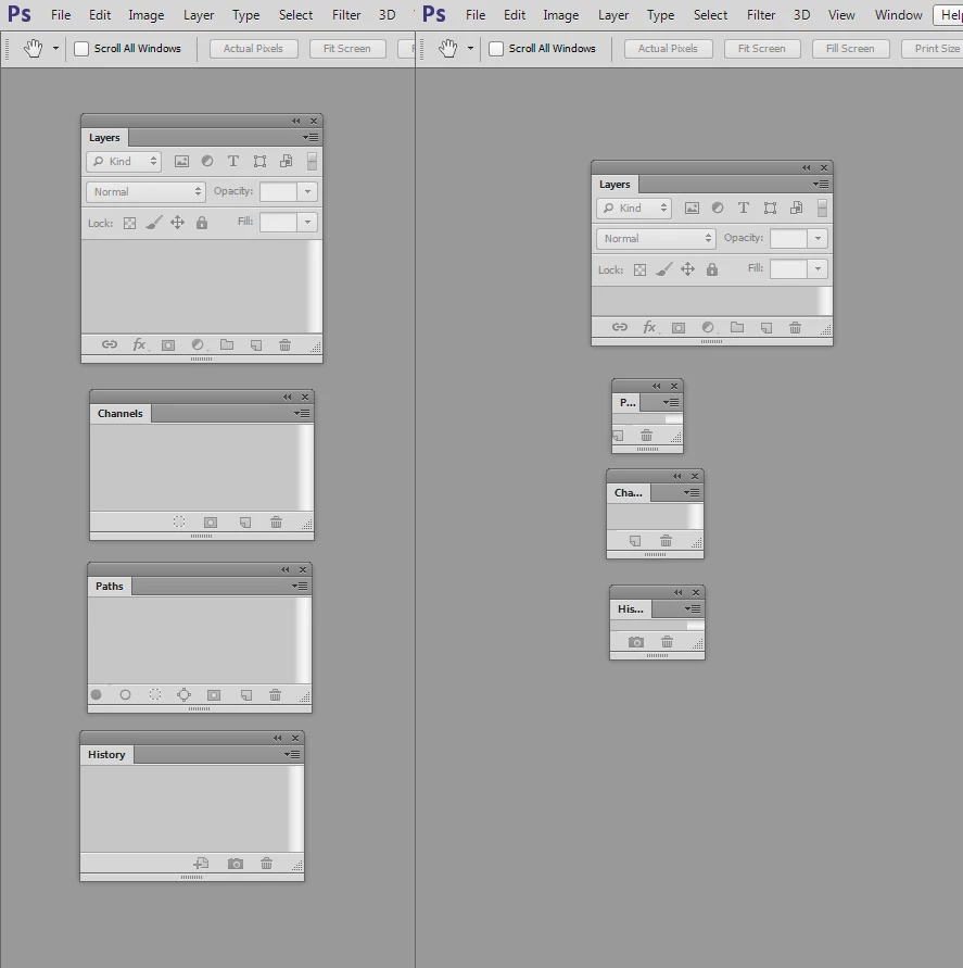 It can be seen that not all panels can be reduced arbitrarily. It depends on the minimum sizes of some controls, as in the example in the layers palette.