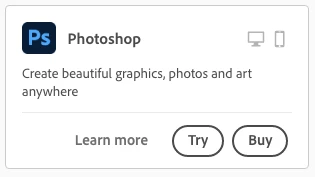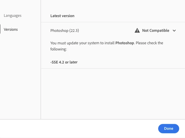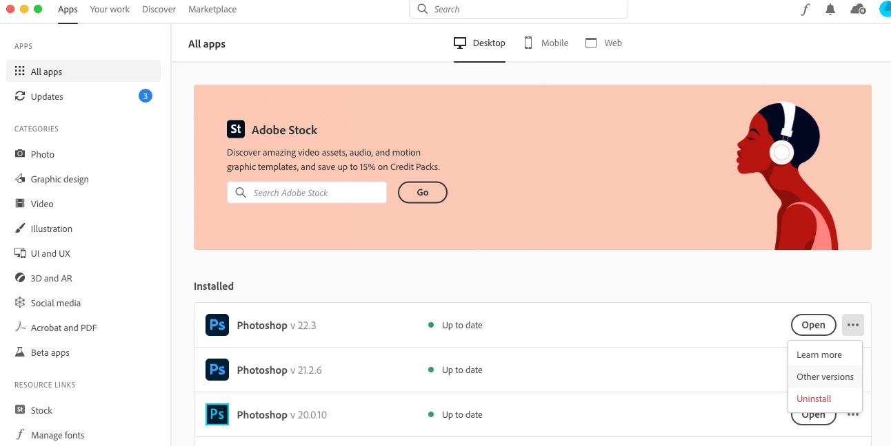 When I look for previous versions, all instructions say I should click the "More options" near the Photoshop on the Creative Cloud app, but the "More options" option is not an option anymore! I can't find that, all I see is this when I hover: