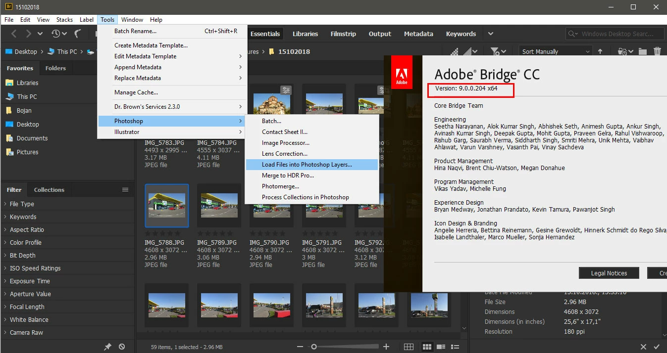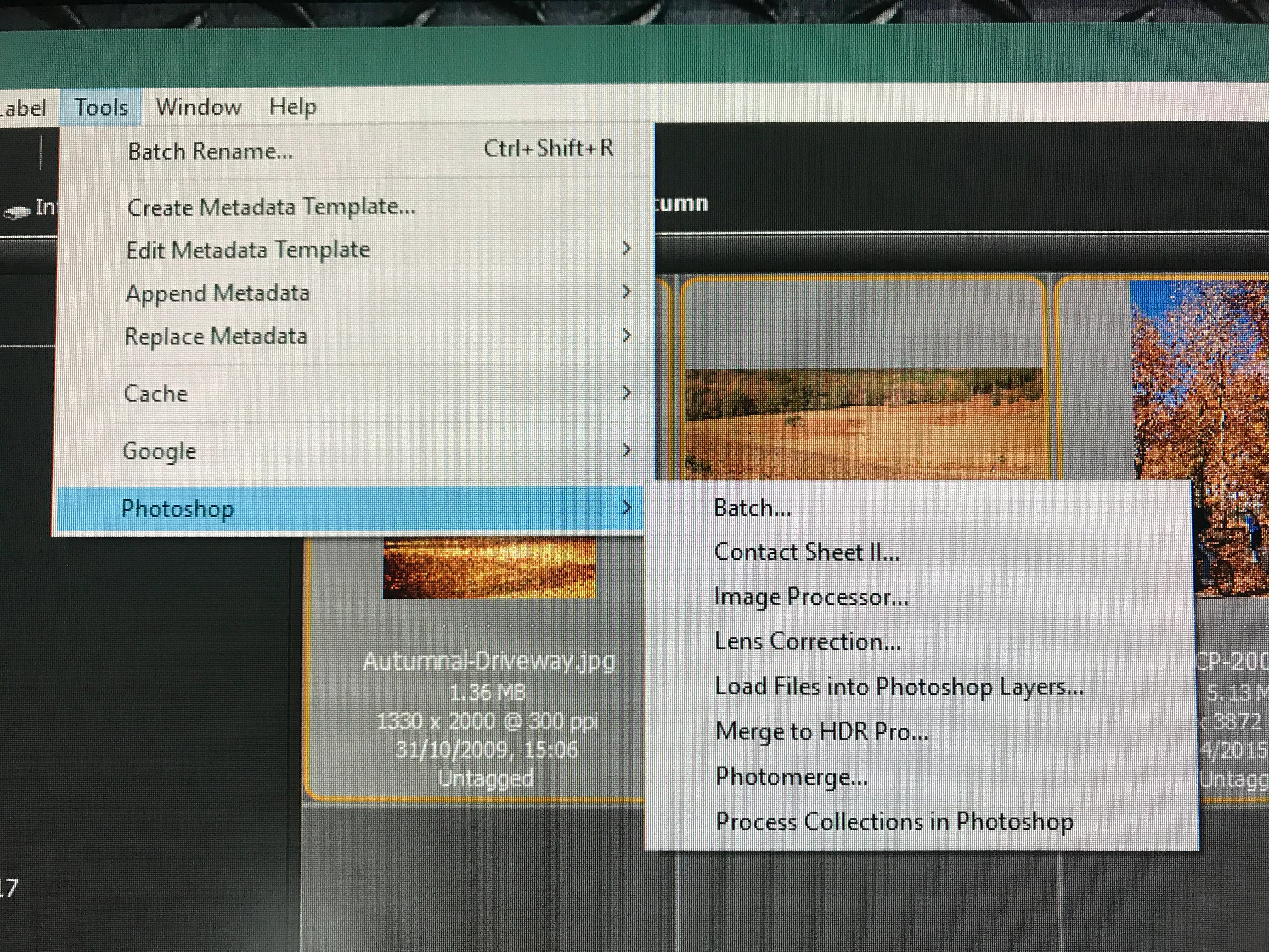 Formerly in bridge Tools pulled down more options than in new Bridge. Where did Tools/Photoshop/Load Files into Photoshop Layers get to in new Bridge?