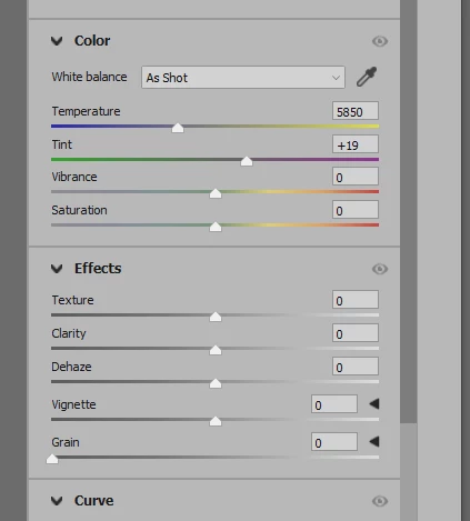 Vibrance and Saturation are in the Color section, and Dehaze is in the Effects section.
