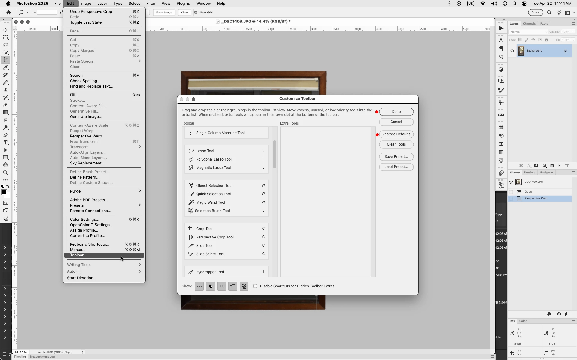 In Photoshop go to Edit>Toolbar, click Restore Defaults then Done