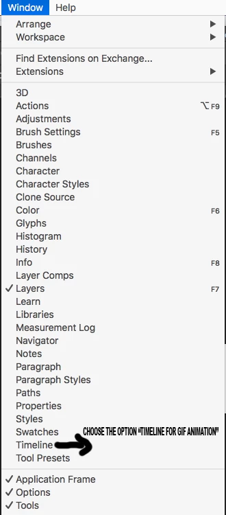 Can somebody please tell me where on EARTH is the "Animation" option under Window?! I currently have Photoshop CC 2019. My computer is a macOS High Sierra version 10.13.6 (I'm not sure if that really even matters, but whatever). I wanna make and edit gifs. I've had Photoshop CS5 for God knows how many years and it always had that "Animation" under Window option. Yes, I can see the layers when I open up the gif file under the Layers palette. [Please see imagines I posted on here]. Do I have to go to File>New>New Document and select a certain one that is used for gifs or should I download some extension to Photoshop altogether? Please let me know! I am a sad Panda