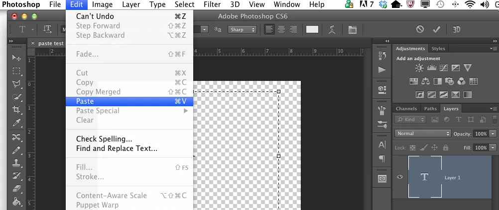 3. In Photoshop, go to the Edit menu at the top of the screen and mouse down to Paste.