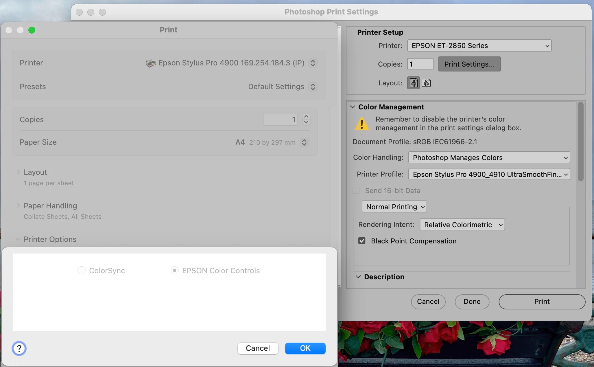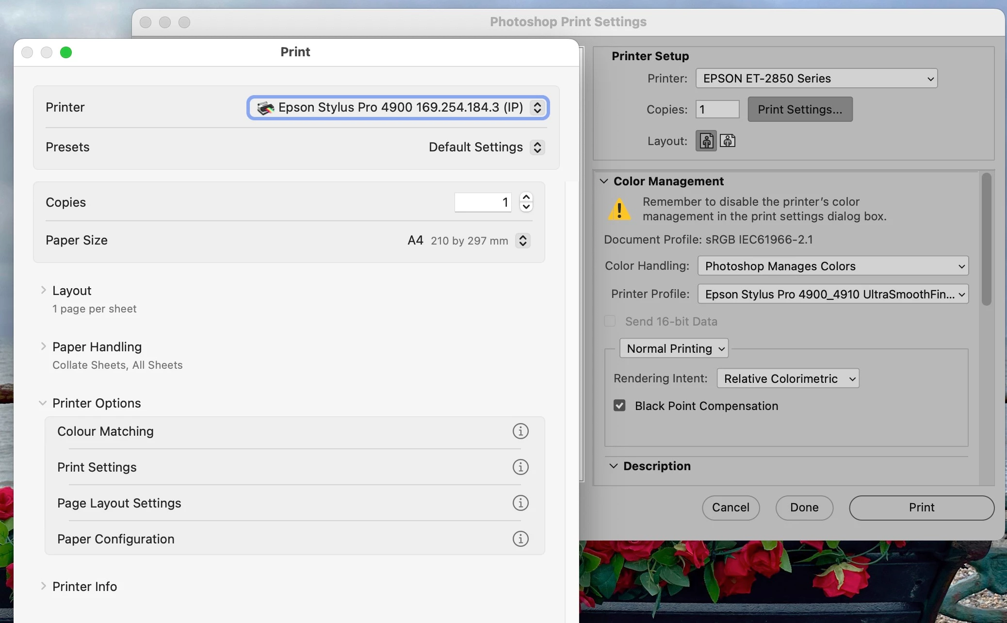 I have been using photoshop for printing my prints for the last year printing to my canon pro 300 and using hahnemuhle german etching paper. suddenly after updating my laptop and photoshop the colours of my prints are extremely exaggerated and incorrect. I have re downloaded all the new drivers for the printer and the icc profiles for the paper however i have woked out the issue lies with photoshop when i select "photoshop manages colours" in the print dialogue box. has anyone else had this issue or know how i can fix this?