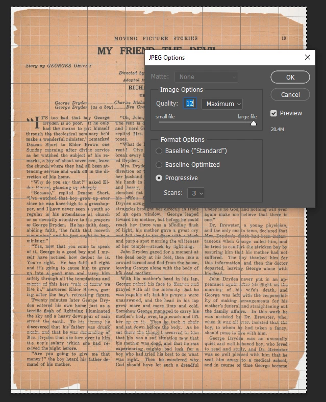 I scanned this magazine page, saved it as a 600 dpi JPG and then cropped all four corners. The original size of the scan file was 11MB.