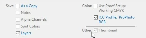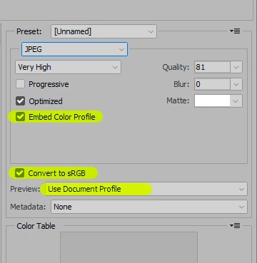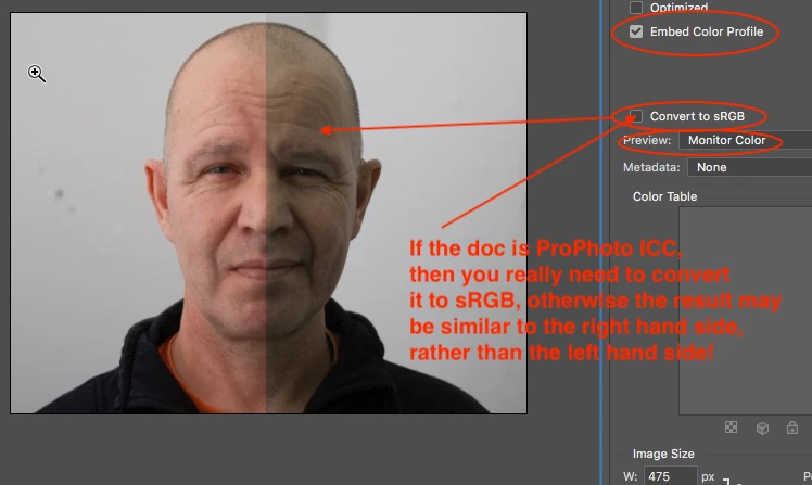 I have used this before but never seen this. I open a RAW image in Photoshop and I've got PRO Photo RGB as color profile, I edit some more with my photo and then I save it by Export > Save for webb (Legacy).