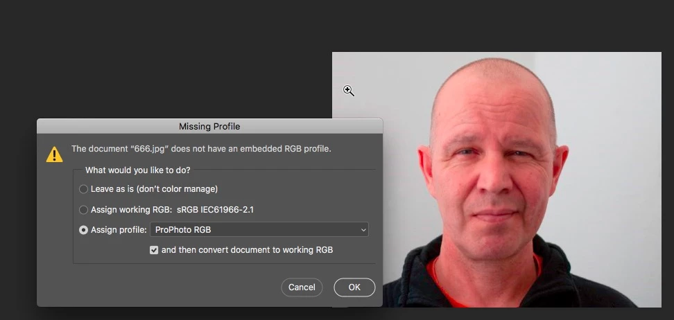 When I then open my image again I get the box where I choose Convert document's colors to the workspace. Then the skintones are all red, how come?
