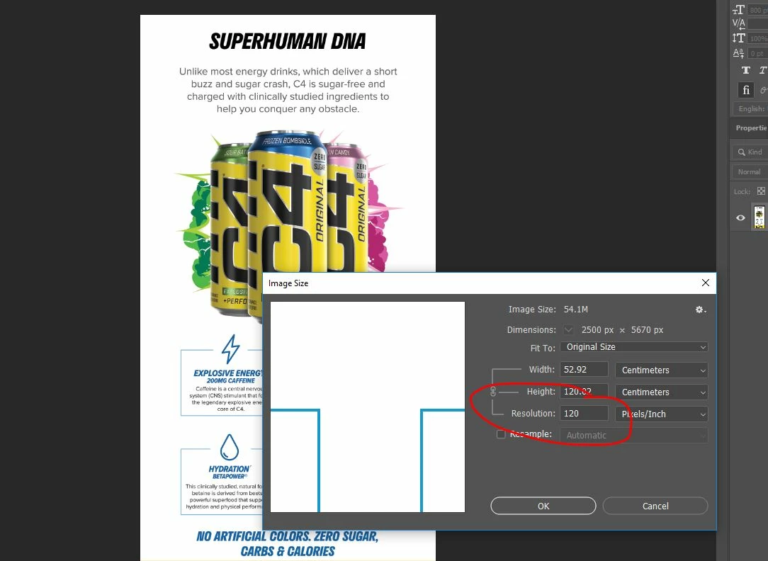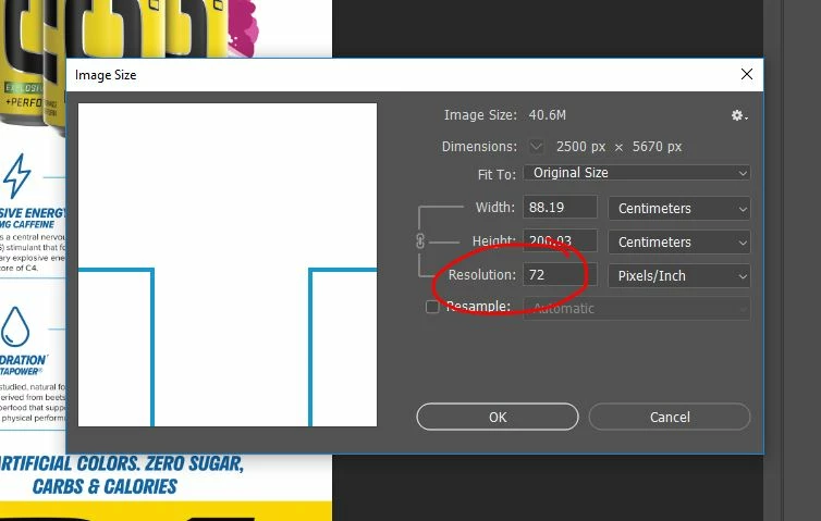I'm trying to create signs for a client who has a TV screen that can only display images in 2500x5670 pixels at 120 resolution. If I supply an image that is 72 resolution, it doesn't work.