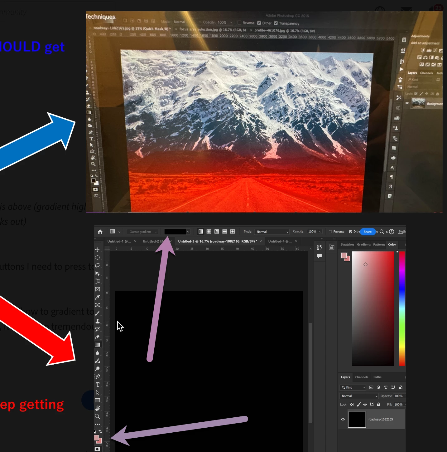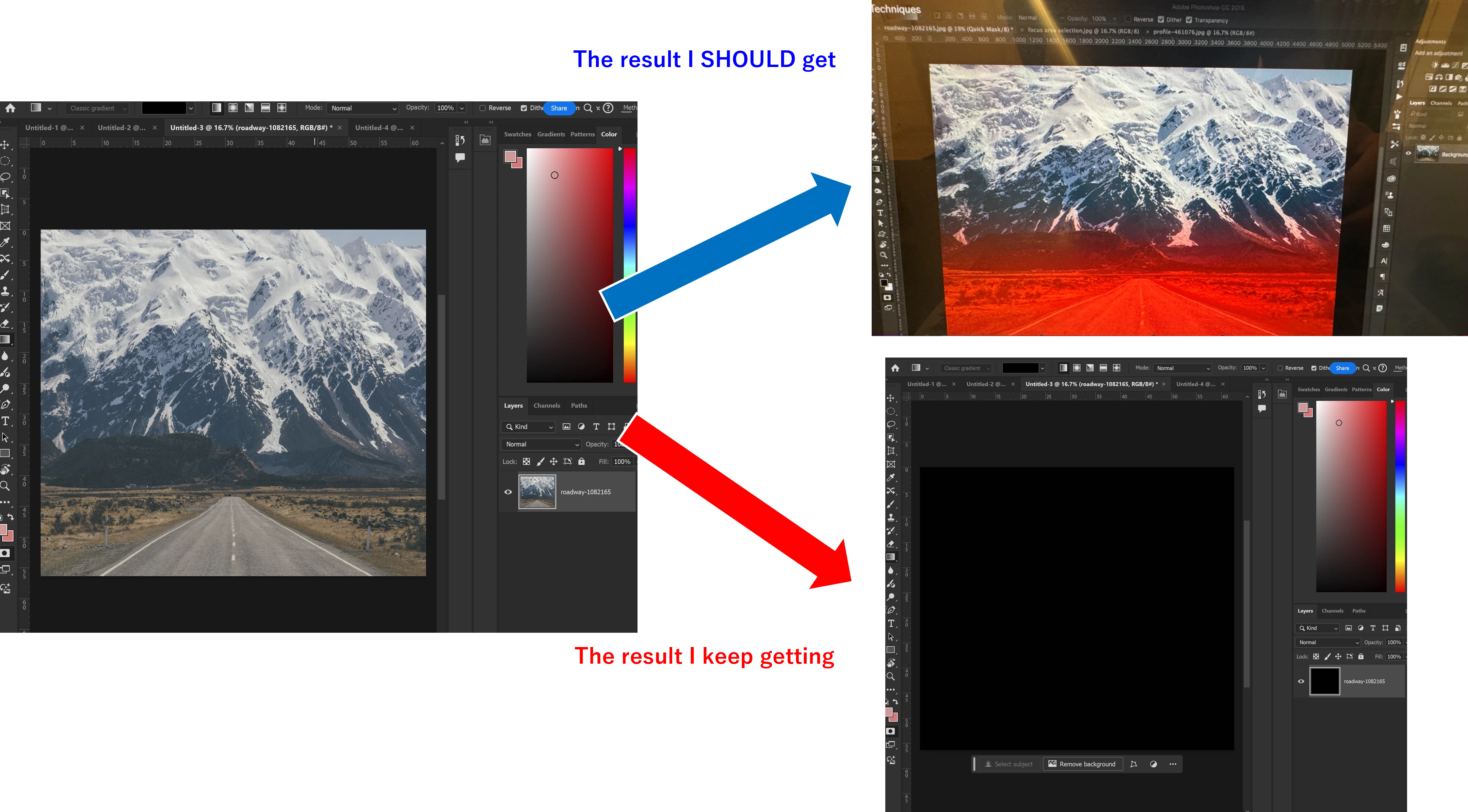 Left is the photograph both the tutorial and I start with, and the result from the tutorial is above (gradient highlighted in red to transparent) and my results are below (completed ruins the photograph and blacks out)