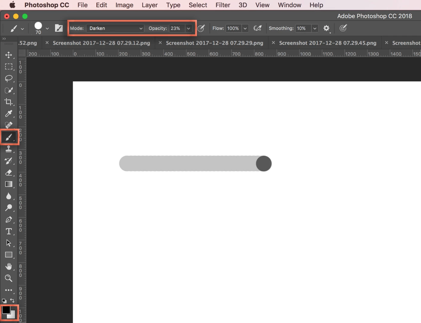 Then set the color to Black, the Mode to Darken and lower the Opacity. Drag out a line, then reposition you mouse over the end point and click until it gets dark enough.