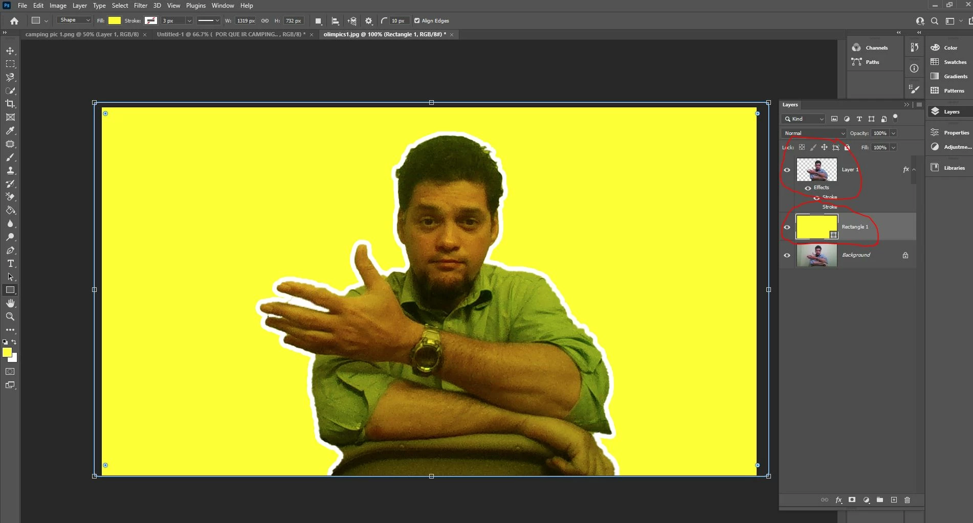 So I have a picture on top, and a yellow square under it. Why is the yellow color feeding through on the top layer? If I change the color to blue, green, etc, it feeds to the top layer and the picture changes color as well... What is going on? I want the top layer to be color independent from the layer under it.