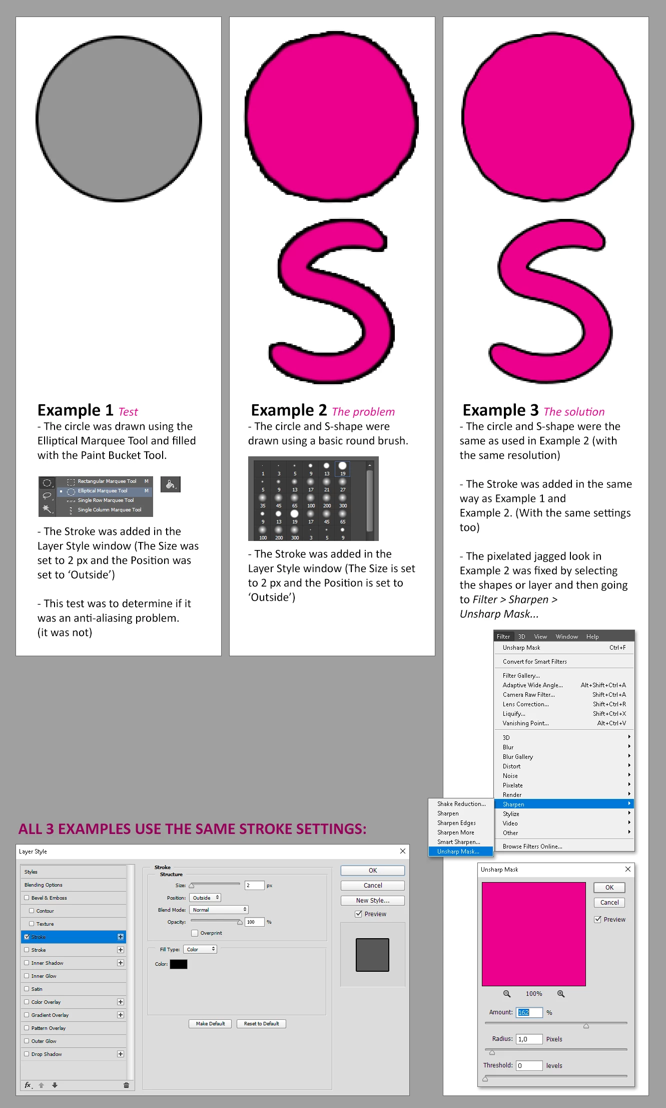 I made a sheet describing the steps I took to fix this problem. All examples use the same stroke settings. In example 2 I recreated the problem with the jaggy looking stroke and I fixed it in example 3.